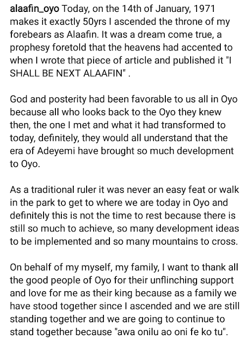 Alaafin of Oyo, Oba Lamidi Olayiwola Adeyemi III is today, 14th of January celebrating his 50th year on the throne.