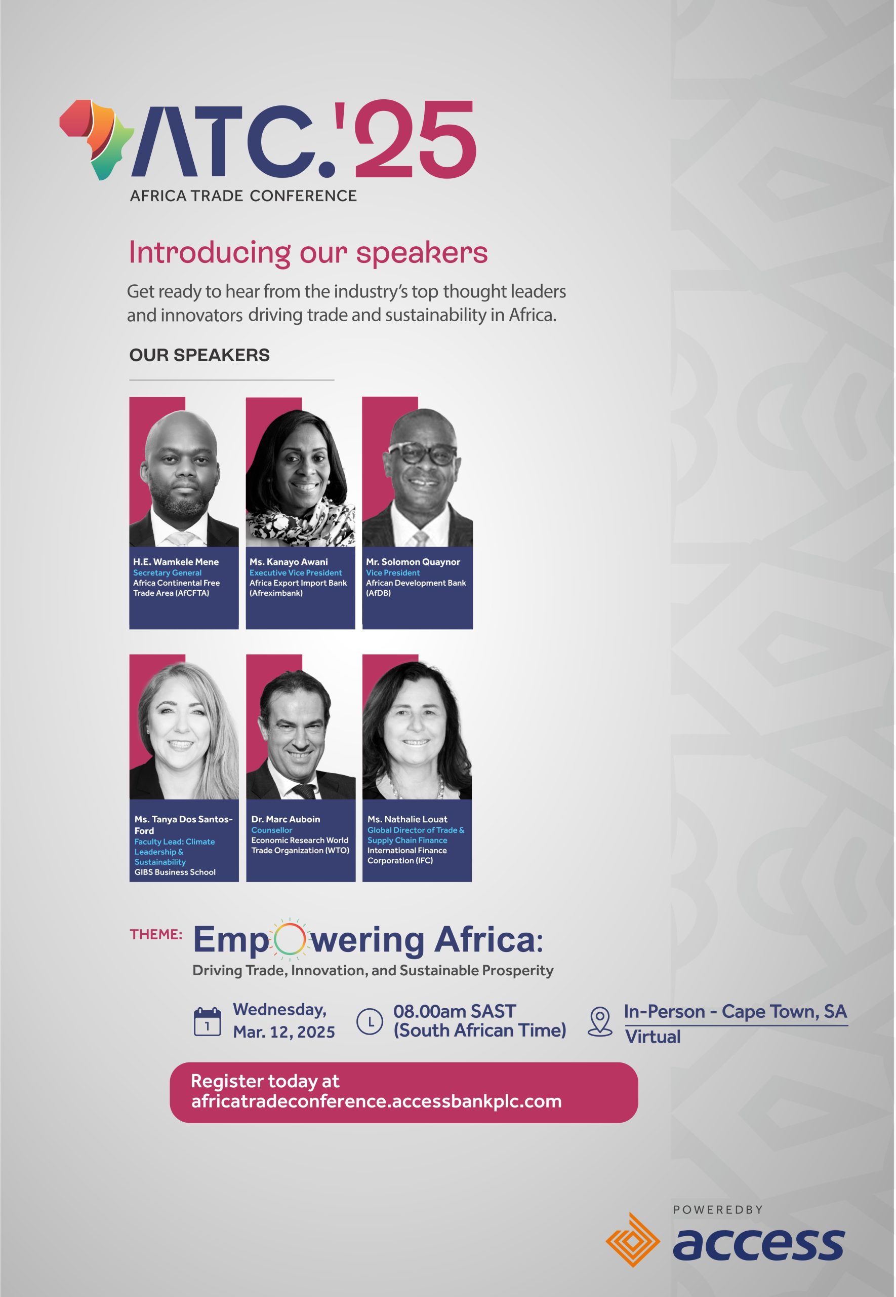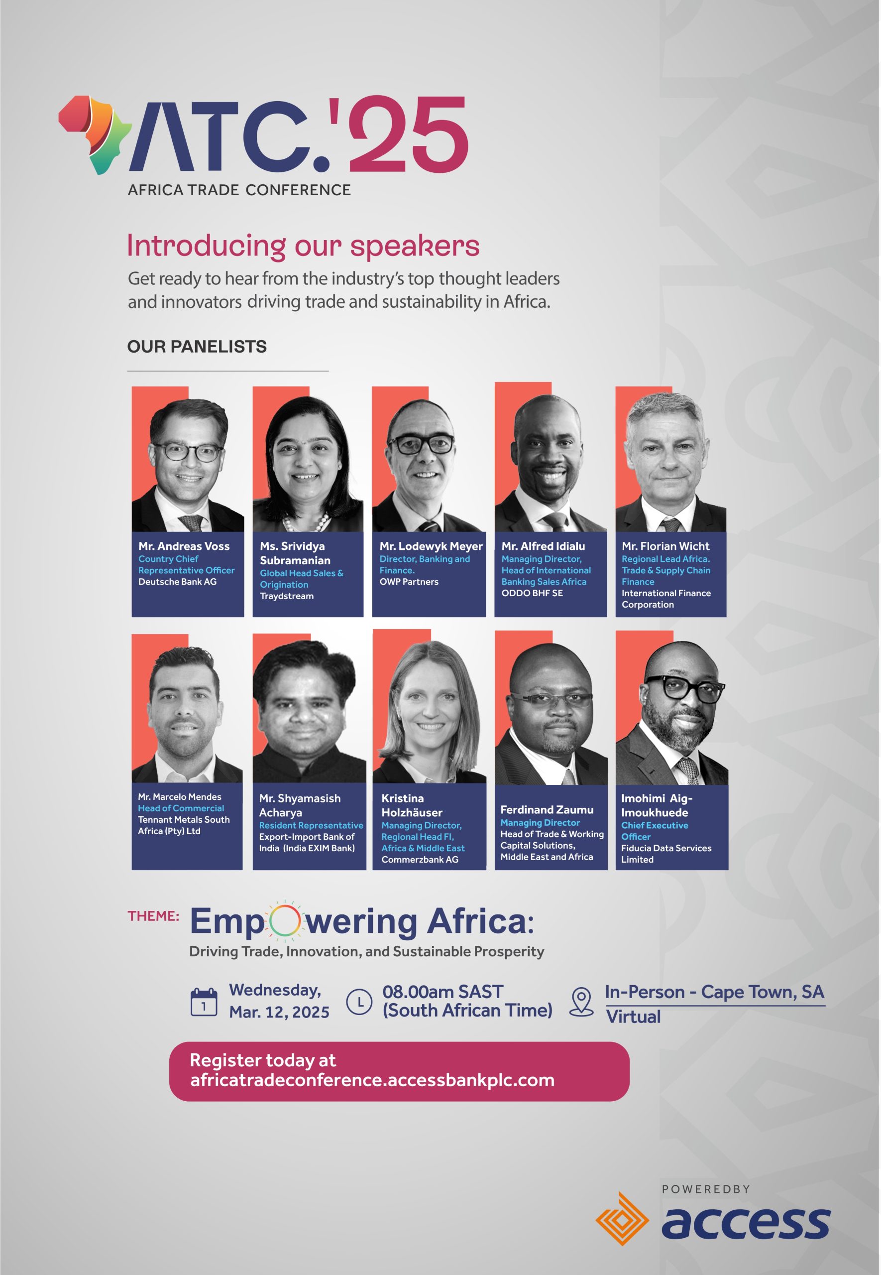 Access Bank PLC, Africa’s leading financial institution, today, announced a distinguished line-up of speakers for the maiden edition of its highly anticipated Africa Trade Conference 2025, set to hold on Wednesday, March 12, 2025, at the Cape Town International Convention Centre (CTICC), South Africa. Under the theme “Empowering Africa: Driving Trade, Innovation, and Sustainable Prosperity”, the conference will convene some of the most influential figures in global finance, trade, and economic development to discuss the future of commerce and investment across the continent.