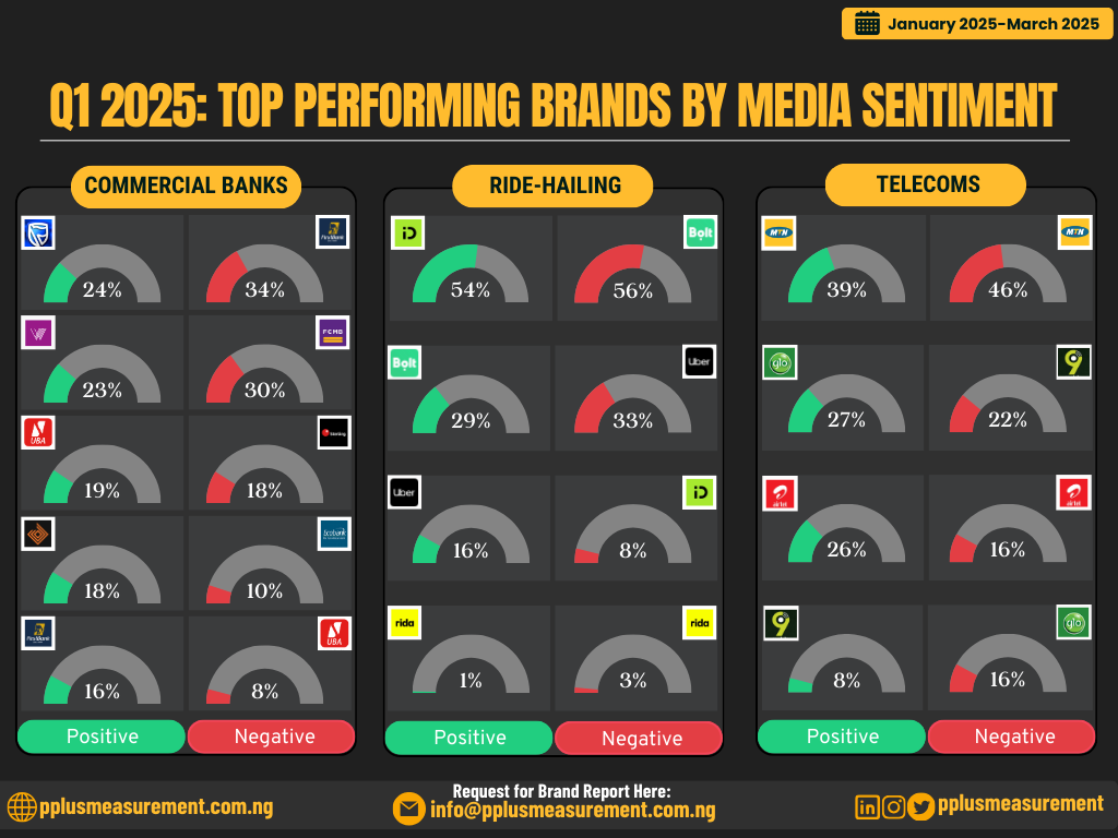 Leveraging advanced media intelligence frameworks, the Q1 2025 analysis encompassed data from 28 commercial banks, 4 major telecommunications providers, and 4 leading ride-hailing platforms. The study deployed rigorous monitoring, measurement, and auditing techniques, drawing from structured metadata points such as editorial tone, CEO visibility, public discourse, and brand-specific media traction. By quantifying sentiment across these variables, the analysis offers a strategic lens into how media narratives—beyond operational milestones—are actively shaping brand trust, credibility, and relevance across Nigeria’s core economic sectors.