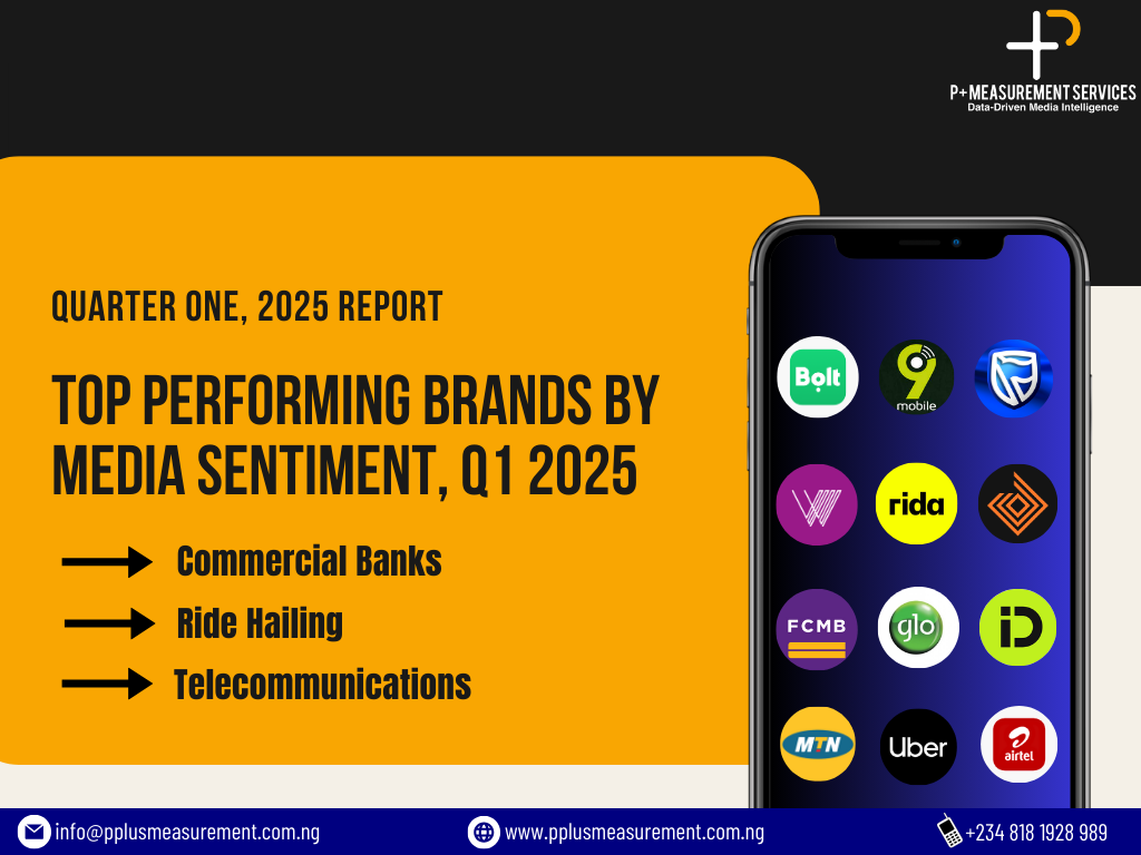 Following the Central Bank of Nigeria’s directive to harmonize exchange rates and the subsequent spike in the dollar-to-naira rate—reaching over ₦1,600/$1 in official markets— Nigeria’s commercial banking, ride-hailing, and telecommunications sectors demonstrated media resilience in Q1 2025. This is the key insight from a comprehensive sentiment audit by P+ Measurement Services, Nigeria’s foremost media intelligence consultancy, which analysed over 1.3 million online publications and 2,100 print media articles locally and globally during the period.