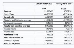 Nestlé Nigeria PLC has announced its financial results for the first quarter of 2022, ending 31 March 2022. The company recorded a revenue of N 110.2 billion against N 87.3 billion during the same period in the previous year, a top-line growth of 26.3%. Profit after tax for the period stood at N 18.0 billion according to the unaudited financial statements of the Company.