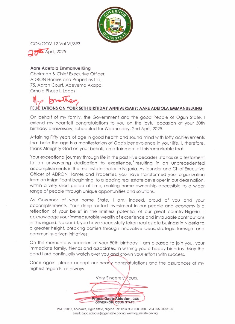 The Governor of Ogun State, Prince Dapo Abiodun, CON, has congratulated real‑estate titan Aare Adetola EmmanuelKing, Chairman and CEO of ADRON Homes & Properties, on his 50th birthday.