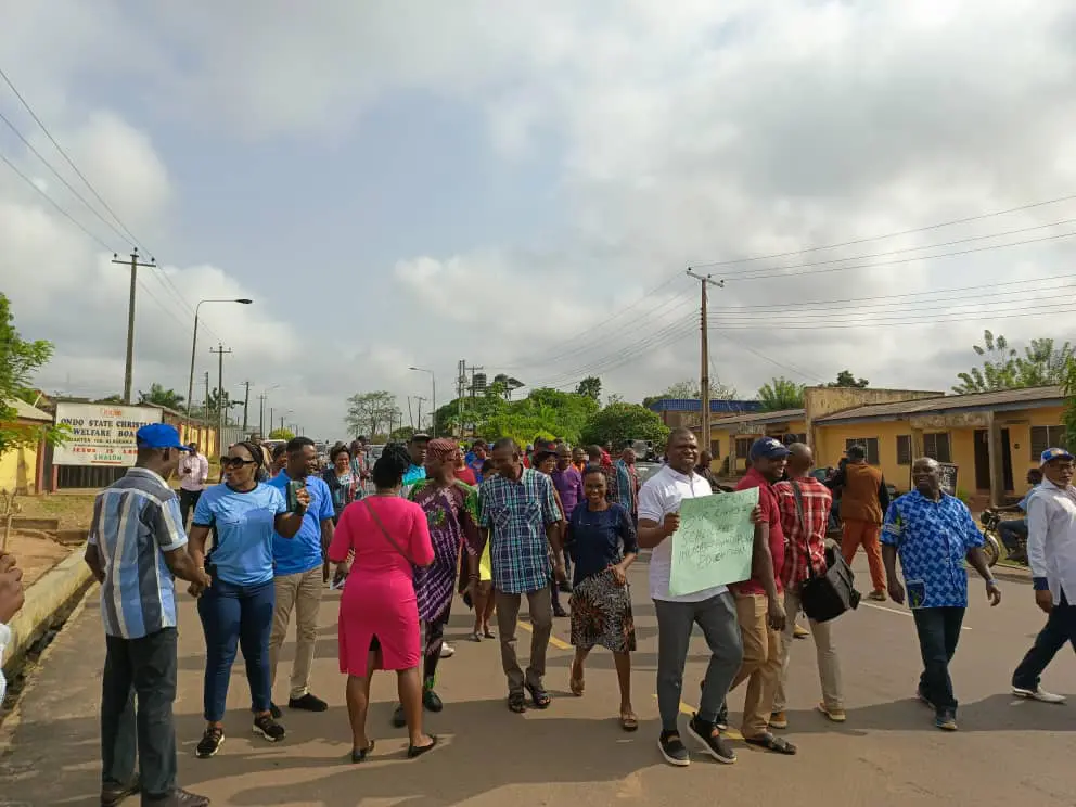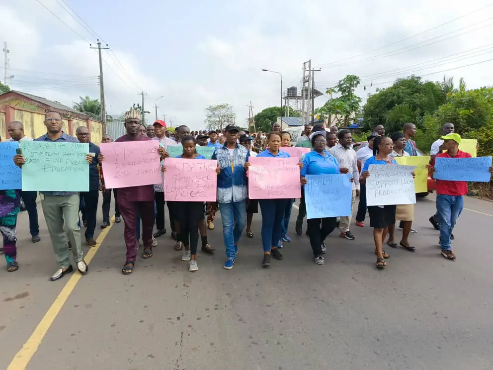 Workers in Ondo State, under the aegis of the Nigeria Labour Congress, NLC, stormed the streets of Akure, the state capital, on Tuesday to protest the prevailing economic hardship in the country.