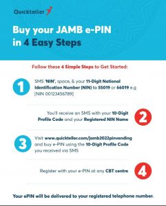 - Visit www.quickteller.com/jamb2022pinvending and buy e-PIN using the 10-digit profile code.